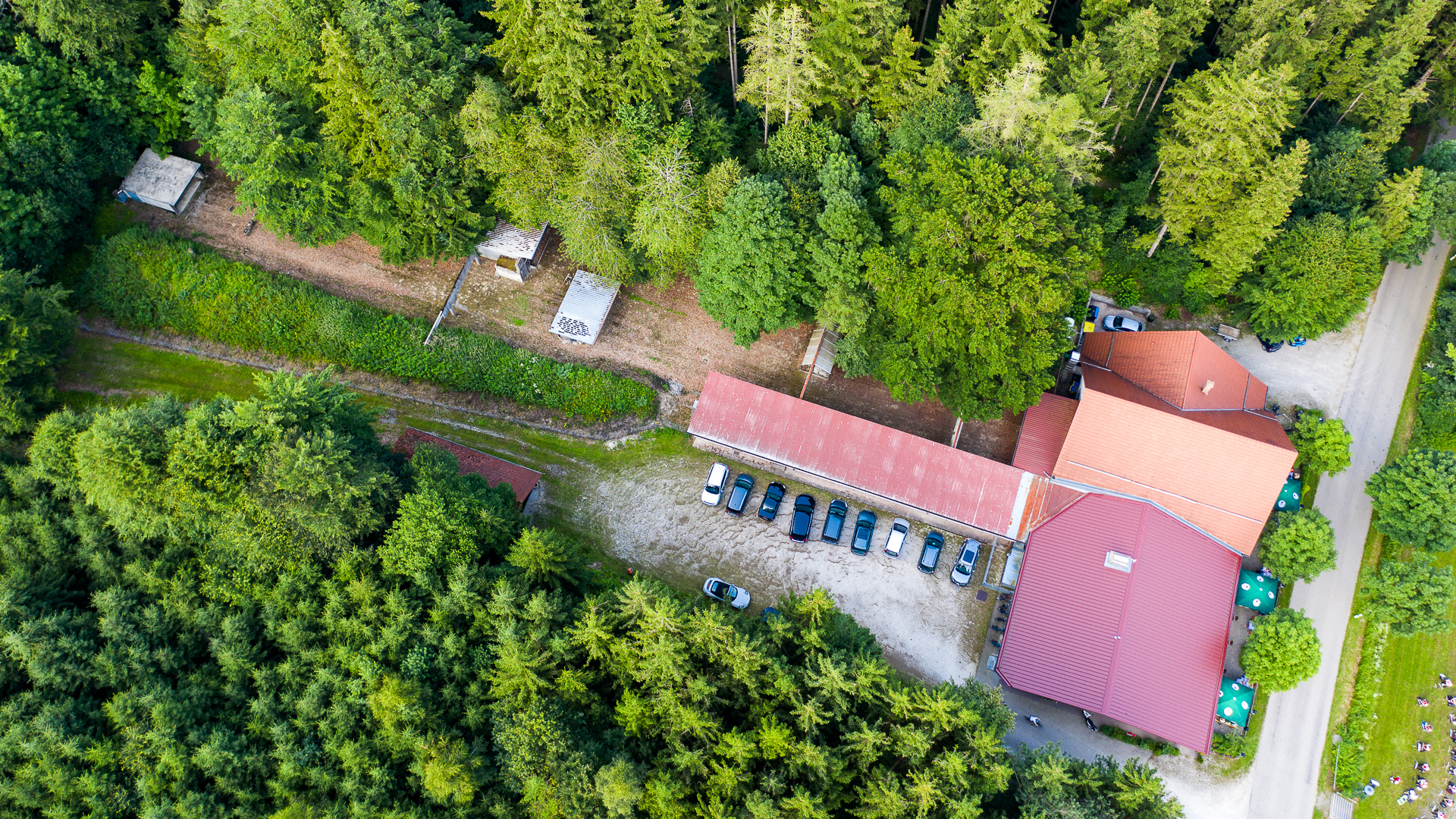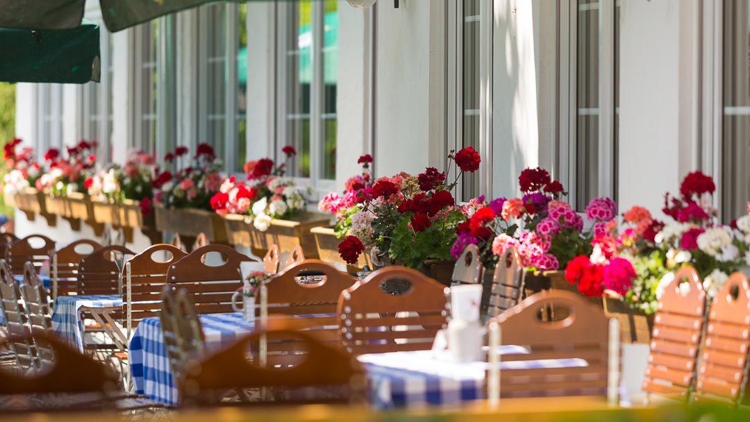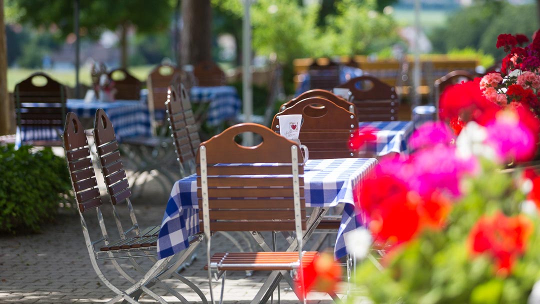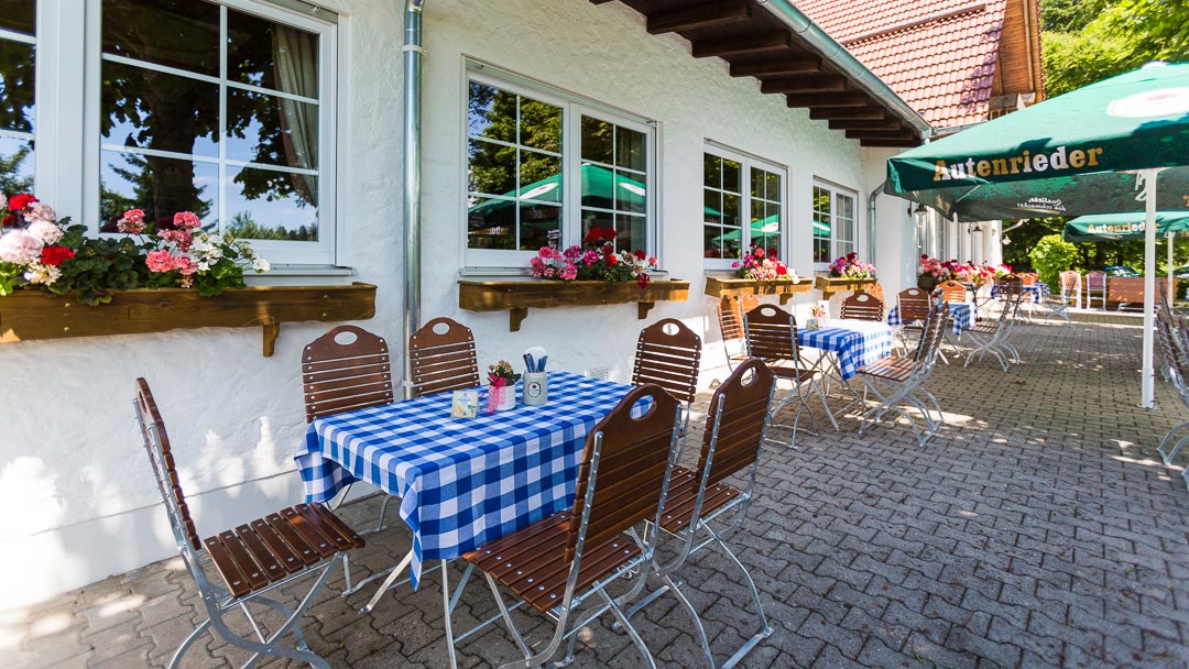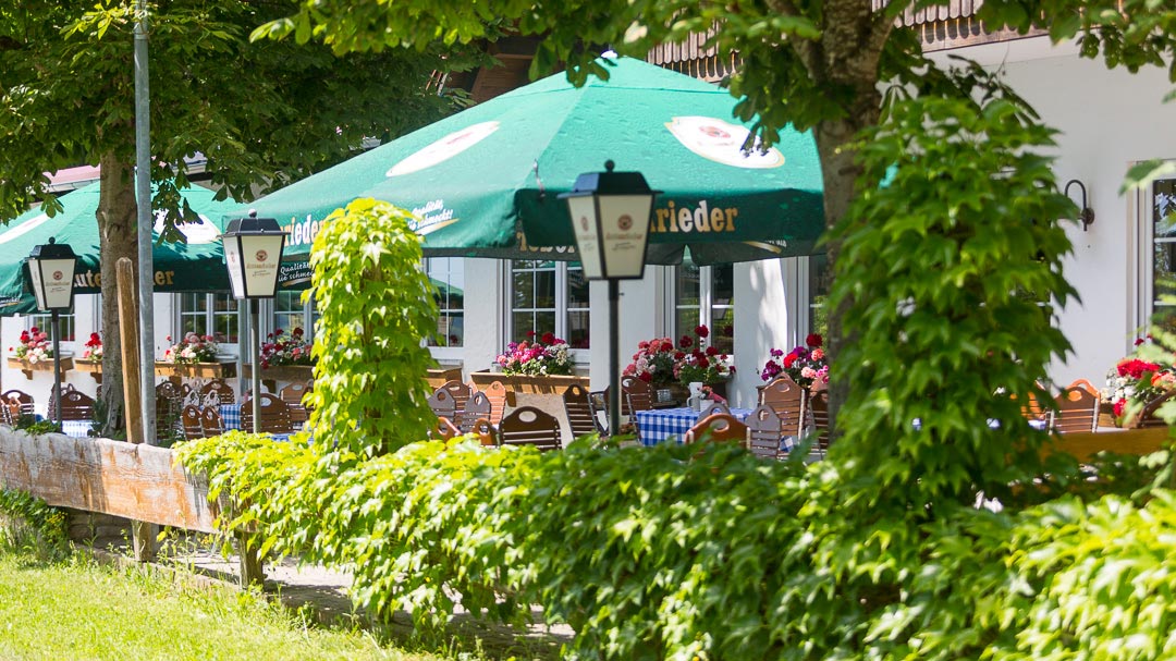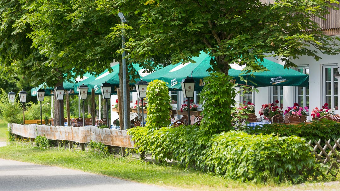 Die Außenterrasse mit 127qm Fläche bietet unter Kastanien und Sonnenschirmen 70 Plätze. Seitlich befindet sich ein kleiner Kinderspielplatz und ein Fahrradständer. Der Biergarten kann abends stimmungsvoll beleuchtet werden. Die hochwertigen Tische und Stühle gehören der Gesellschaft und sollen weiter genutzt werden. Auf unserer Terrasse treffen sich Radler, Freunde & Bekannte, Stammtischler, Ausflugsgäste, Kappellenbesucher, neugierige, junge und alte Gäste.