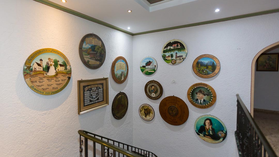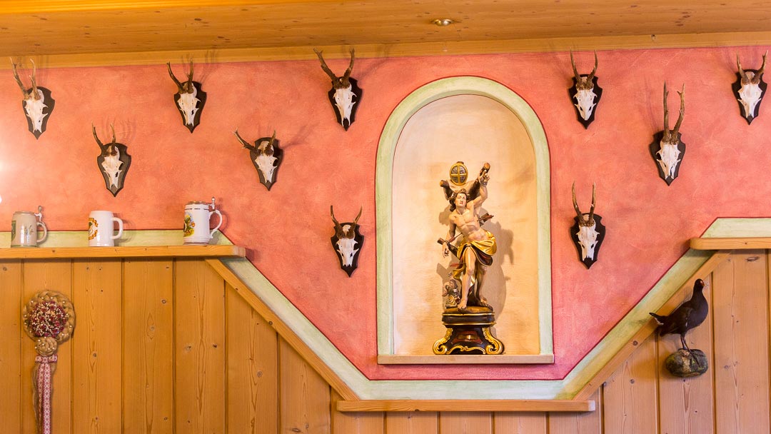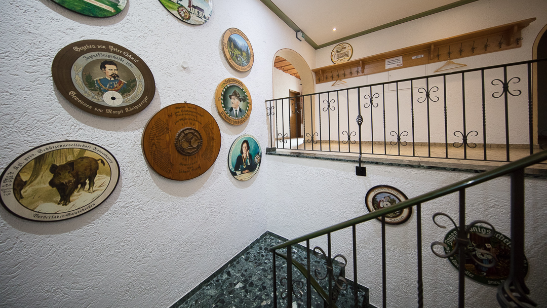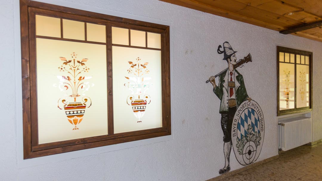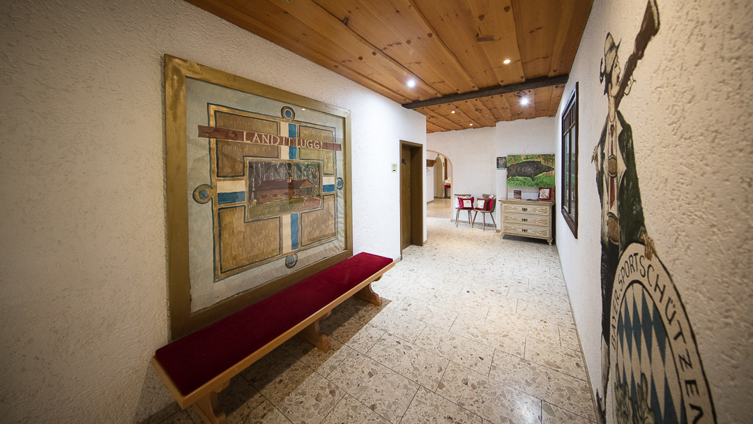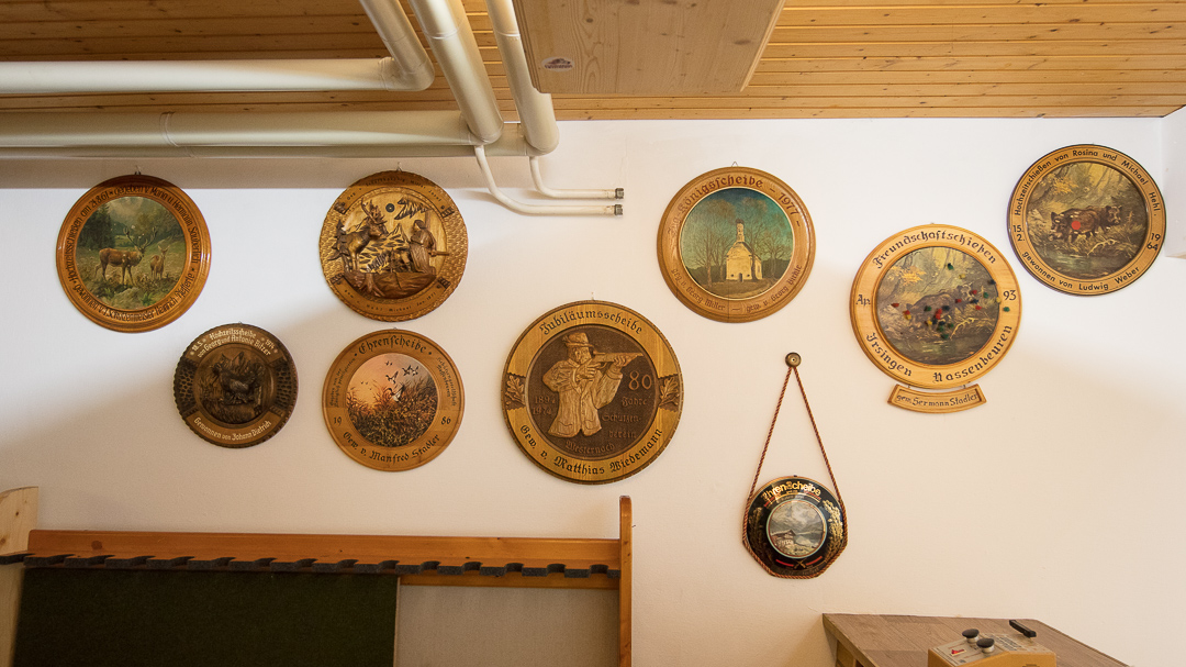 Die Jagdtrophähen der Wanddekoration gehören der Schützengesellschaft oder einzelnen Mitgliedern, genauso wie die zahlreich im ganzen Gebäude verteilten Schützenscheiben, Pokale, Wettbewerbs-Trophähen, Polster und Vorhänge im Landhausstil und einige Kristallleuchter und sollen im Schützenheim verbleiben. Die Dekoration kann und soll natürlich laufend erweitert werden.