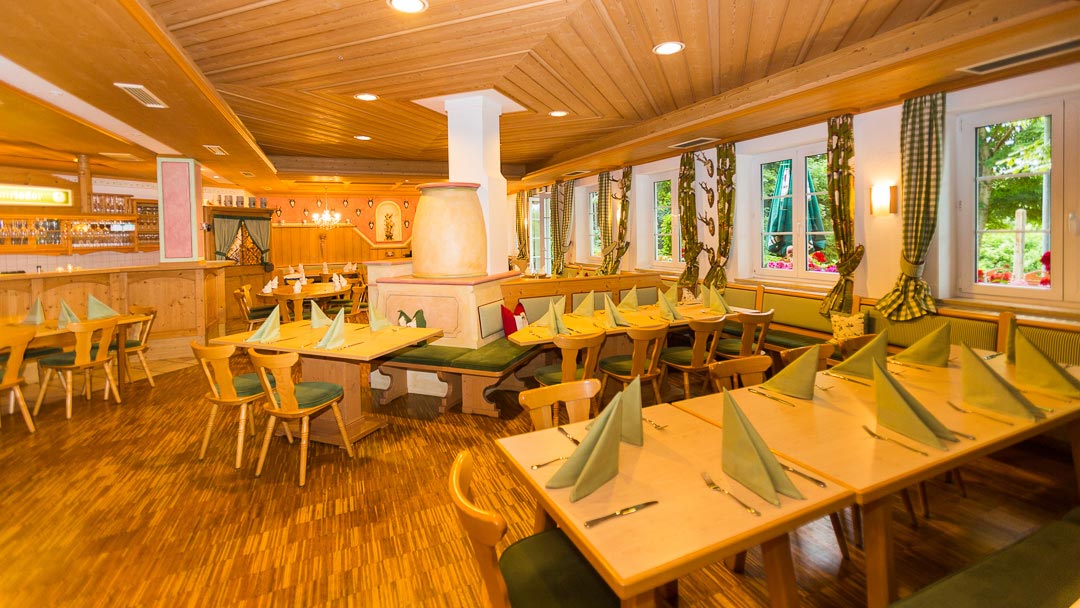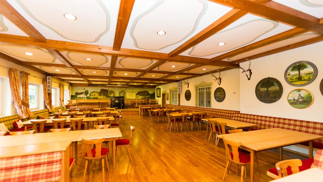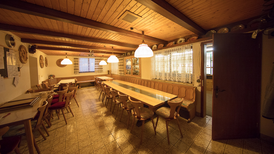 Die Gaststube bietet Platz für ca. 75 Sitzplätze mit ca. 130qm Fläche, mit Bar/Ausschank und rundem großem Stammtisch und Durchgang zum Biergarten und zum Festsaal.