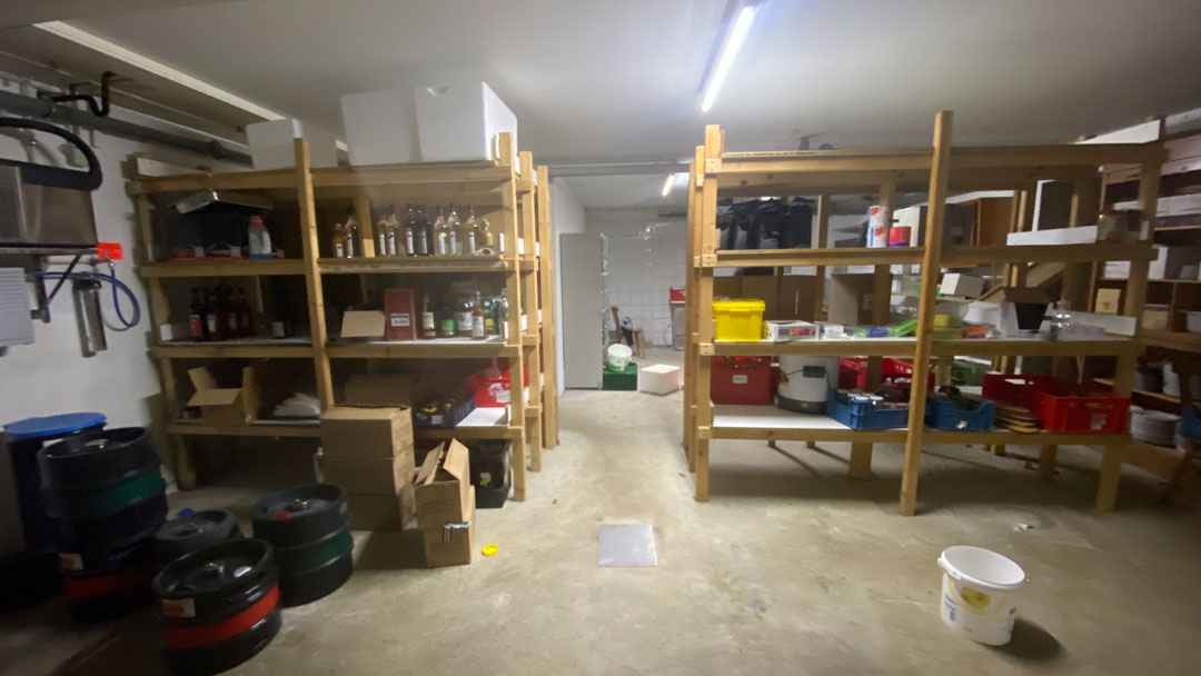 Im Keller befindet sich ein 56qm großes Lager und ein weiterer Kühlraum mit ca. 8qm mit Direktverbindung zur Schanktheke, ein Raum mit Dusche und Waschmaschinenanschluss sowie weitere Neben- und Lagerräume und Platz für ein Pächterbüro.